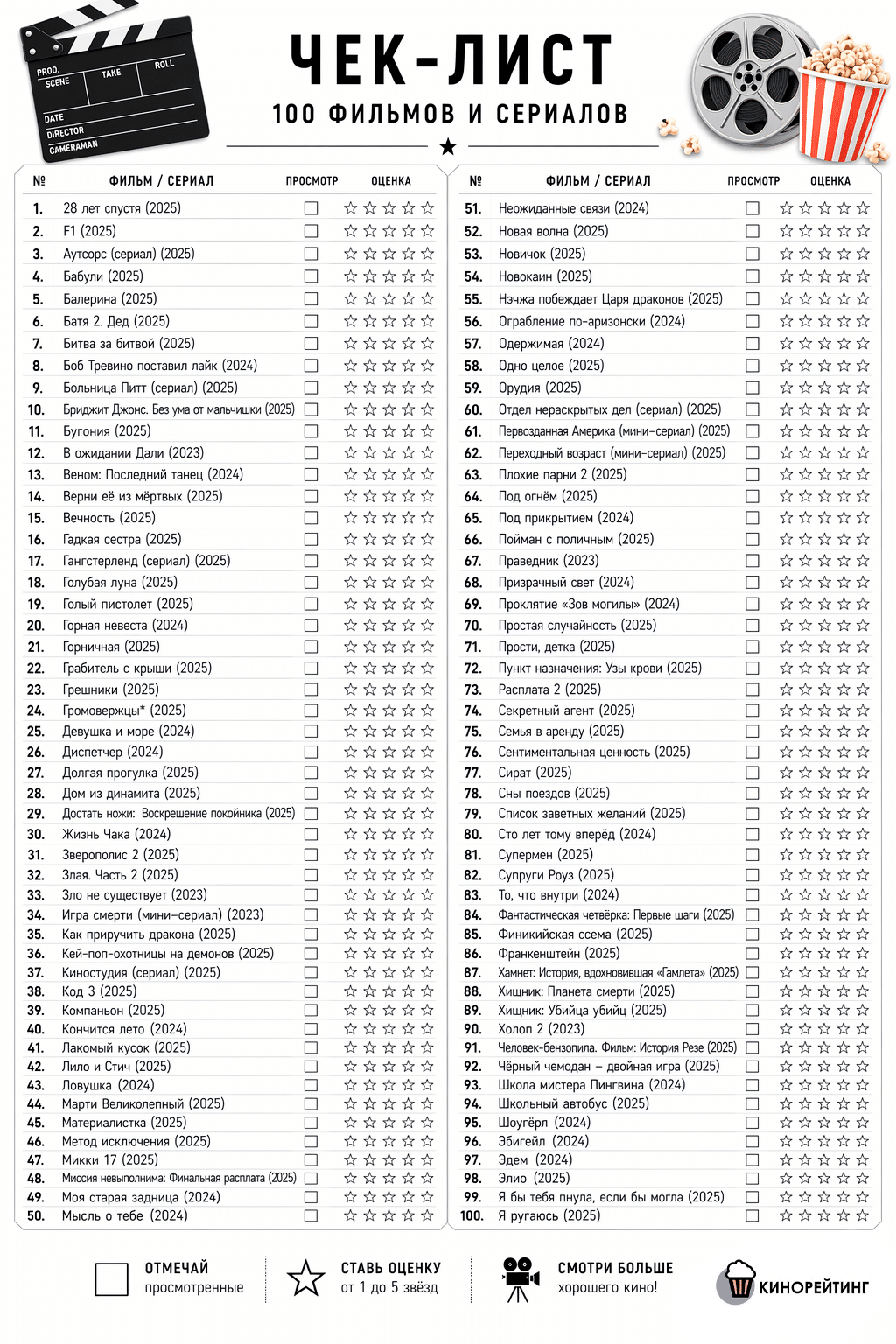 Также мы подготовили для вас чек-лист в котором удобно отмечать уже просмотренные фильмы и выставлять им оценки по 5-балльной системе. Его можно сохранить как картинку и распечатать на принтере.